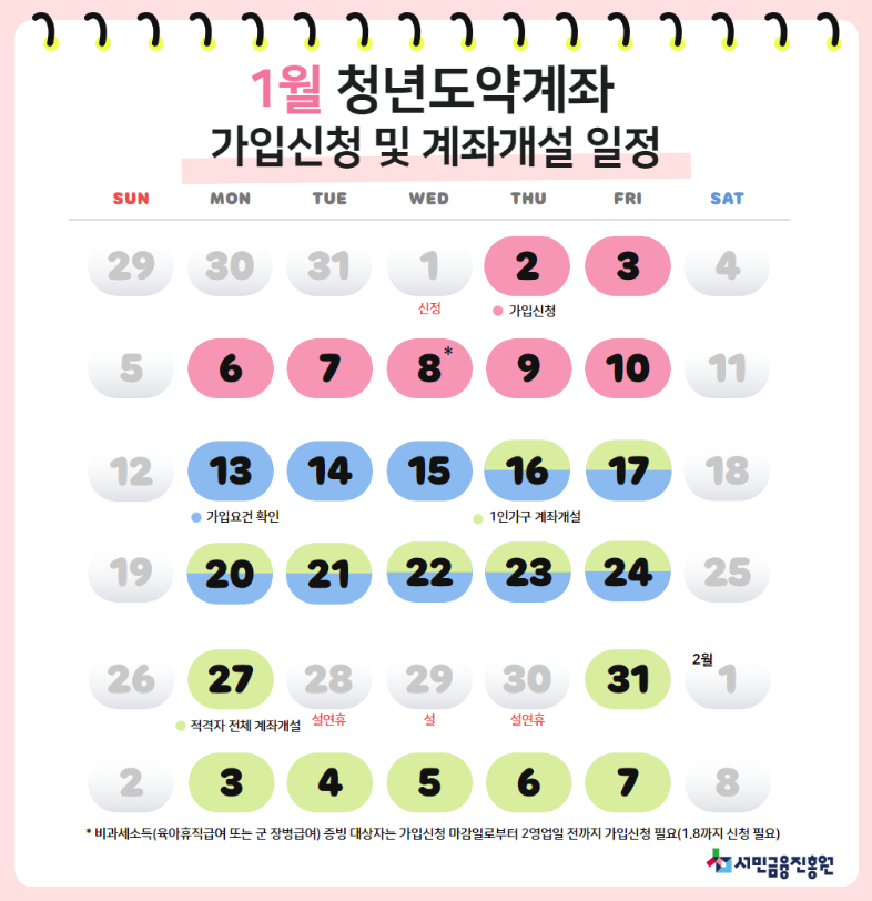 2025년 상반기 기준으로, 청년도약계좌의 신청기간은 매월 1일부터 말일까지로 정해져 있습니다. 신청을 원하는 경우 반드시 해당 월 내에 신청을 완료해야 합니다. 마감 기간이 임박하면 접수가 몰릴 수 있으니, 여유를 두고 신청하세요.